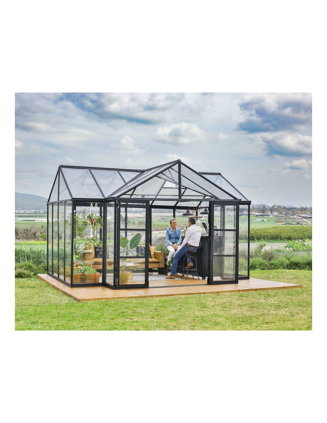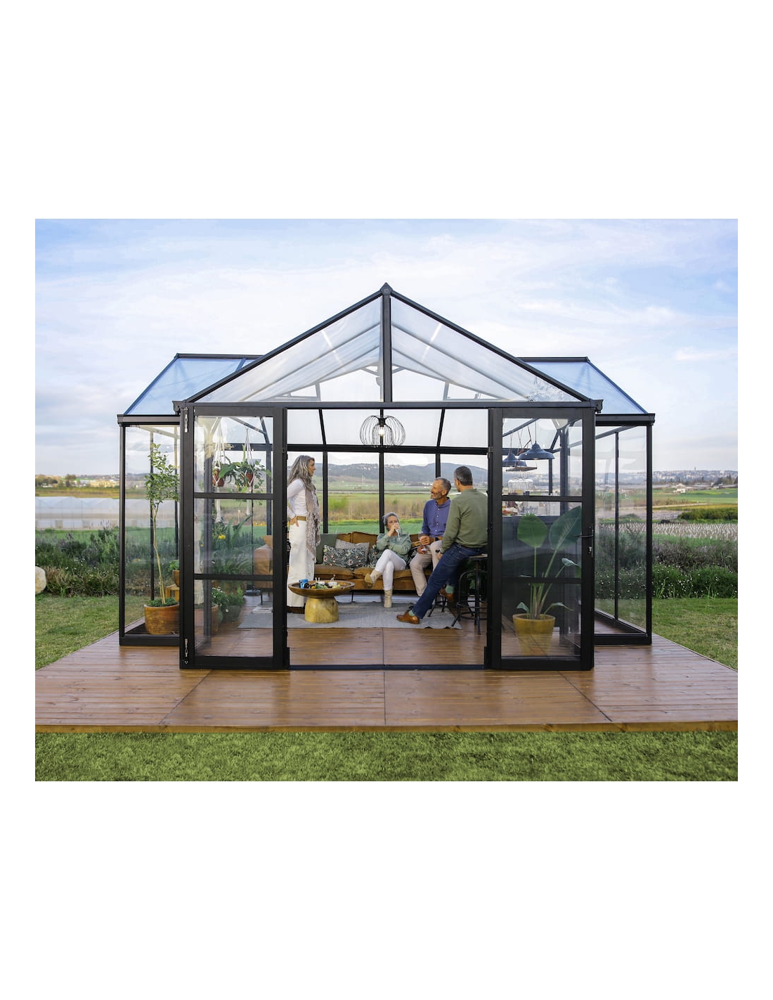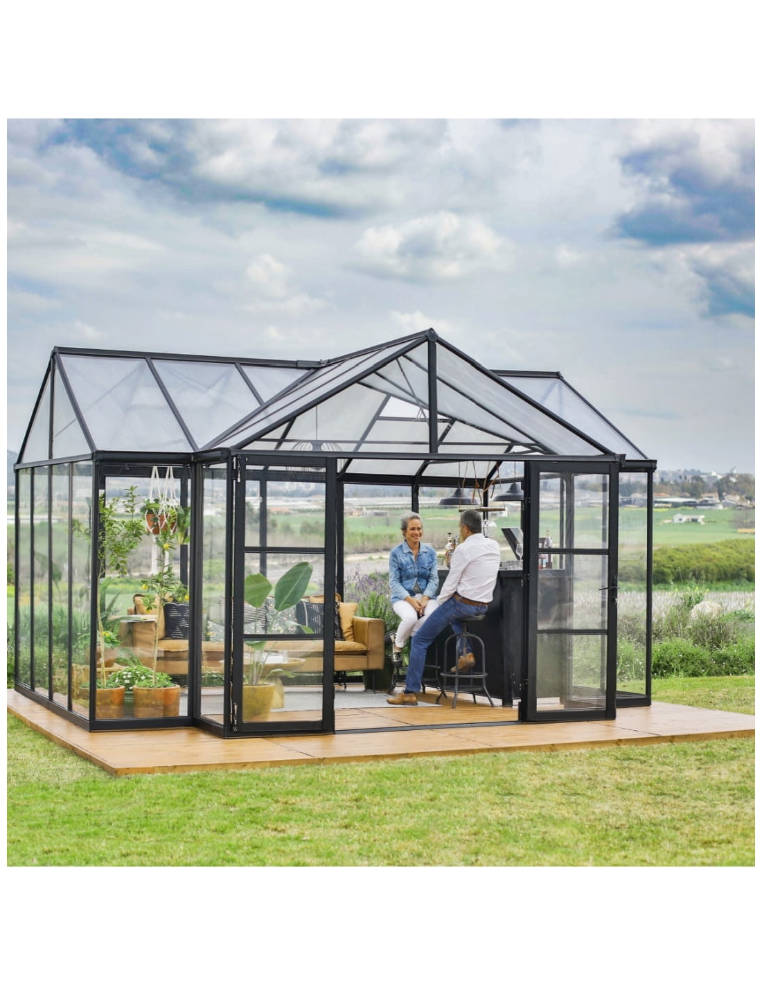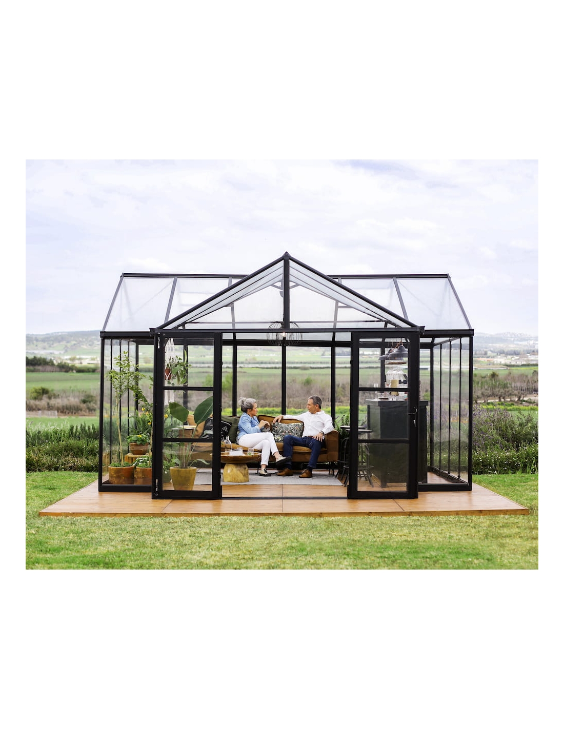 - Ekstra stor struktur: Romslig orangeri på 17 m² med høye tak (112 tommer) og sidevegger (75 tommer).