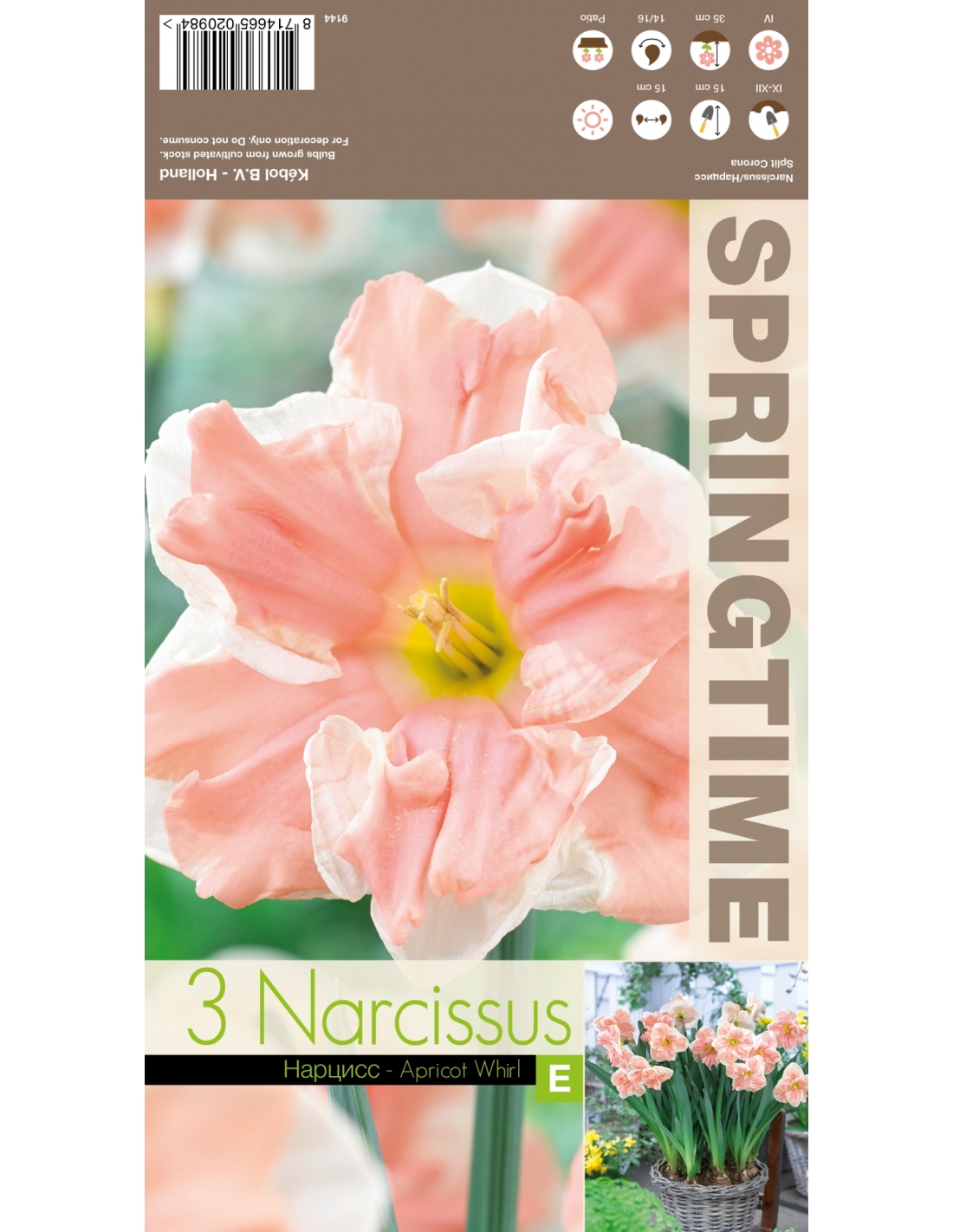 🌼 Flerårig plante med sterke stilker og vakre, linjeformede blader. Blomsterløk Apricot Whirl har store, velduftende blomster, enten enkeltvis eller i klaser. Narsisser deles inn i ulike typer etter blomsterform: smalkronete, syklamenlignende, bredkronete, fylte, bukettblomstrende, poetiske og trompetnarsisser. Ved å velge ulike sorter kan blomstringen forlenges fra slutten av mars til begynnelsen av juni. Tradisjonelle blomsterfarger er hvitt og gult.