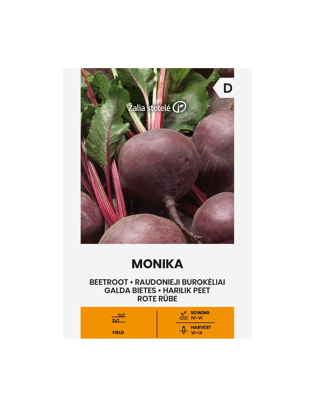 Monika er en middels tidlig og svært pålitelig rødbetesort med jevne, runde røtter og intens mørkerød farge. Denne sorten er kjent for sin gode kvalitet - uten hvite ringer i kjøttet - og egner seg perfekt både til fersk bruk og lagring.
