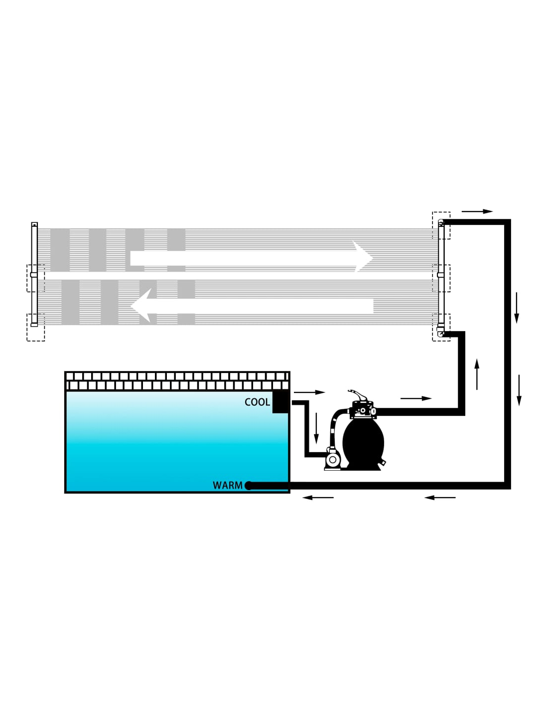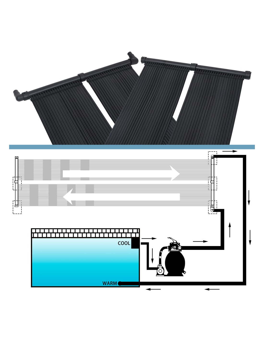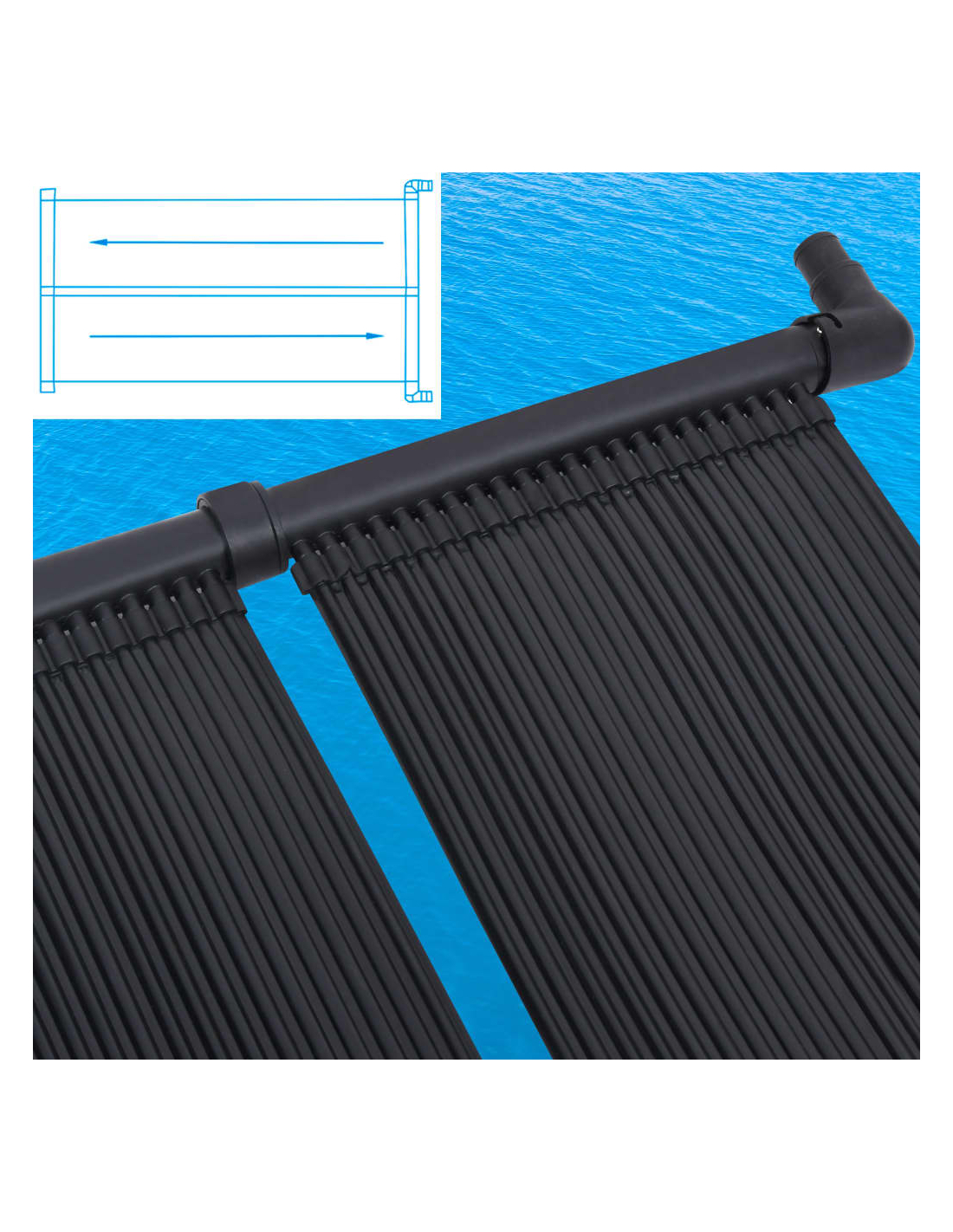 Denne sol bassengvarmeren samler solstråler og gjør dem om til varme og holder ditt basseng komfortabelt varmt. Det øker basseng vanntemperaturen med opp til 10 grader. Med installasjonen av dette varmeapparatet, vil bassengvannet sirkulere gjennom sol kanalene og returnere til ditt basseng godt og varmt. Den er kompatibel med de fleste bassengpumper. Den kan monteres på taket/stativ eller legges på bakken ved bassenget.